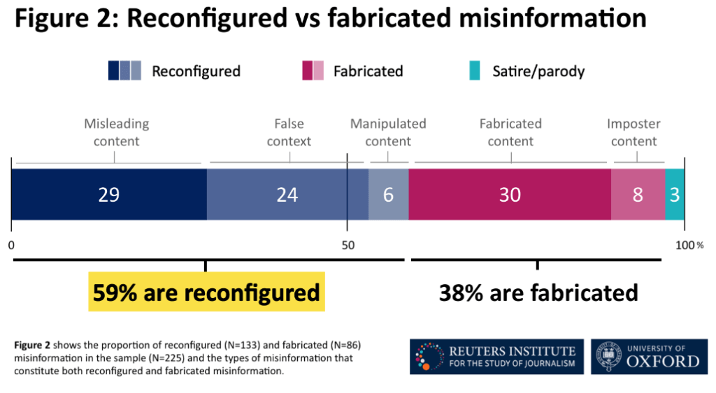 It is misinformation when something was misunderstood and shared by accident and disinformation if wrong information was fabricated on purpose. Some examples are: Playing down the severety, panicmongering, conspiracy theories, and doubtful health recommendations. A study by Brennen and colleagues 2020) which investigated 225 pieces of false information showed that 59% of disinformation twisted reality and 38% were fabricated completely (see figure 1).